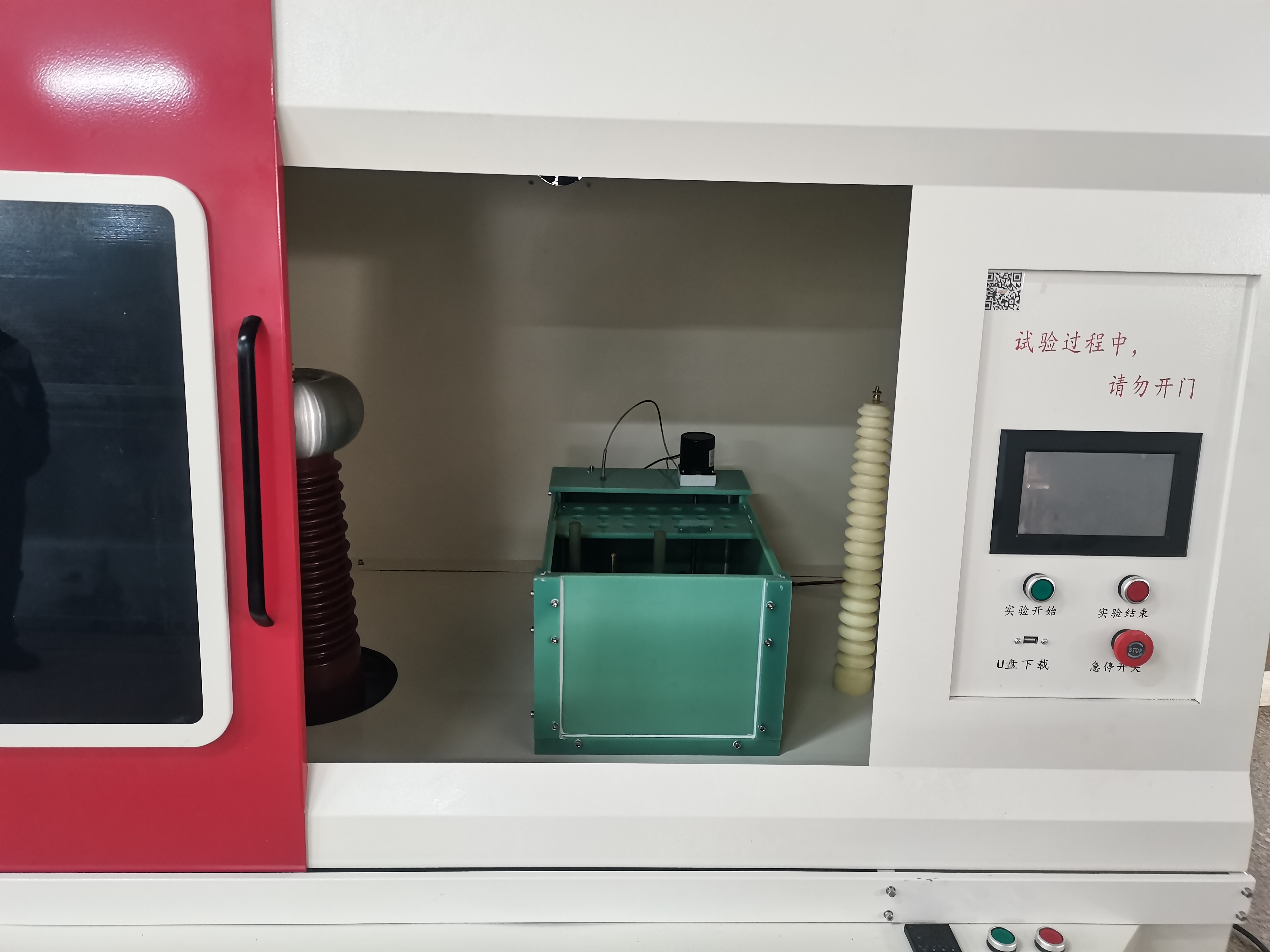 10.設備具有安全警告提示,在未關閉試驗箱門時試驗無法開始,且會在(即:高壓變壓器無輸出)時會彈出警告,且試驗過程中如果開門,試驗會自動結束。